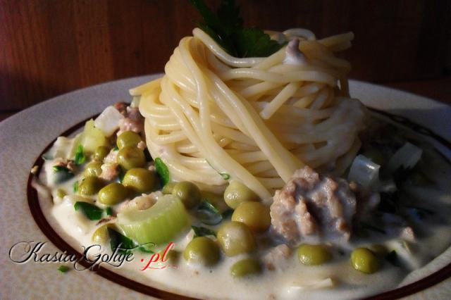 Dawno już nie mieliśmy makaronu, więc na dzisiaj spaghetti z zielonymi dodatkami w sosie śmietanowym, wyszło super! Taki przyjemny sosik, maluda i Jacek wciągnęli dokładki :)