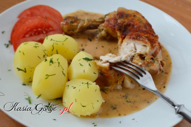 Wrzucamy na wysmarowaną oliwą i dobrze nagrzaną patelnię, smażymy z każdej strony na rumiano, dodajemy odrobinę wody i przykrywamy pokrywką. Dusimy tak długo, aż kurczak będzie miękki.
