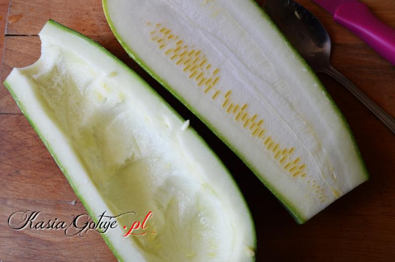 Cukinie przekrawamy wzdłuż, za pomocą łyżki wycinamy środek z pestkami. Skórę zostawiamy, bo inaczej podczas pieczenia lub gotowania wszystko się rozpadnie.
