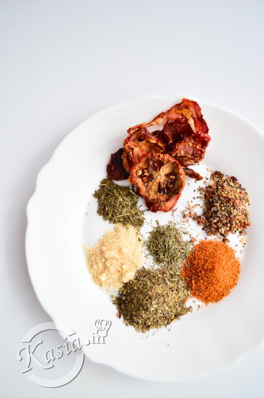 Pomidory kruszymy w moździerzu lub rozdrabniamy nożem. Mieszamy wszystkie składniki ze sobą i przesypujemy do szczelnego pojemniczka.